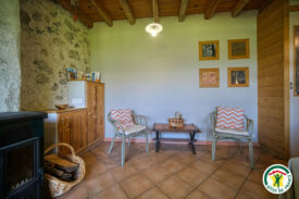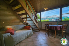 • Séjour avec coin salon (canapé convertible, fauteils, TV poêle à bois), une belle baie vitrée avec vue panoramique sur la montagne  de Glandasse  et une porte vitrée orientée sud donnant sur la terrasse.